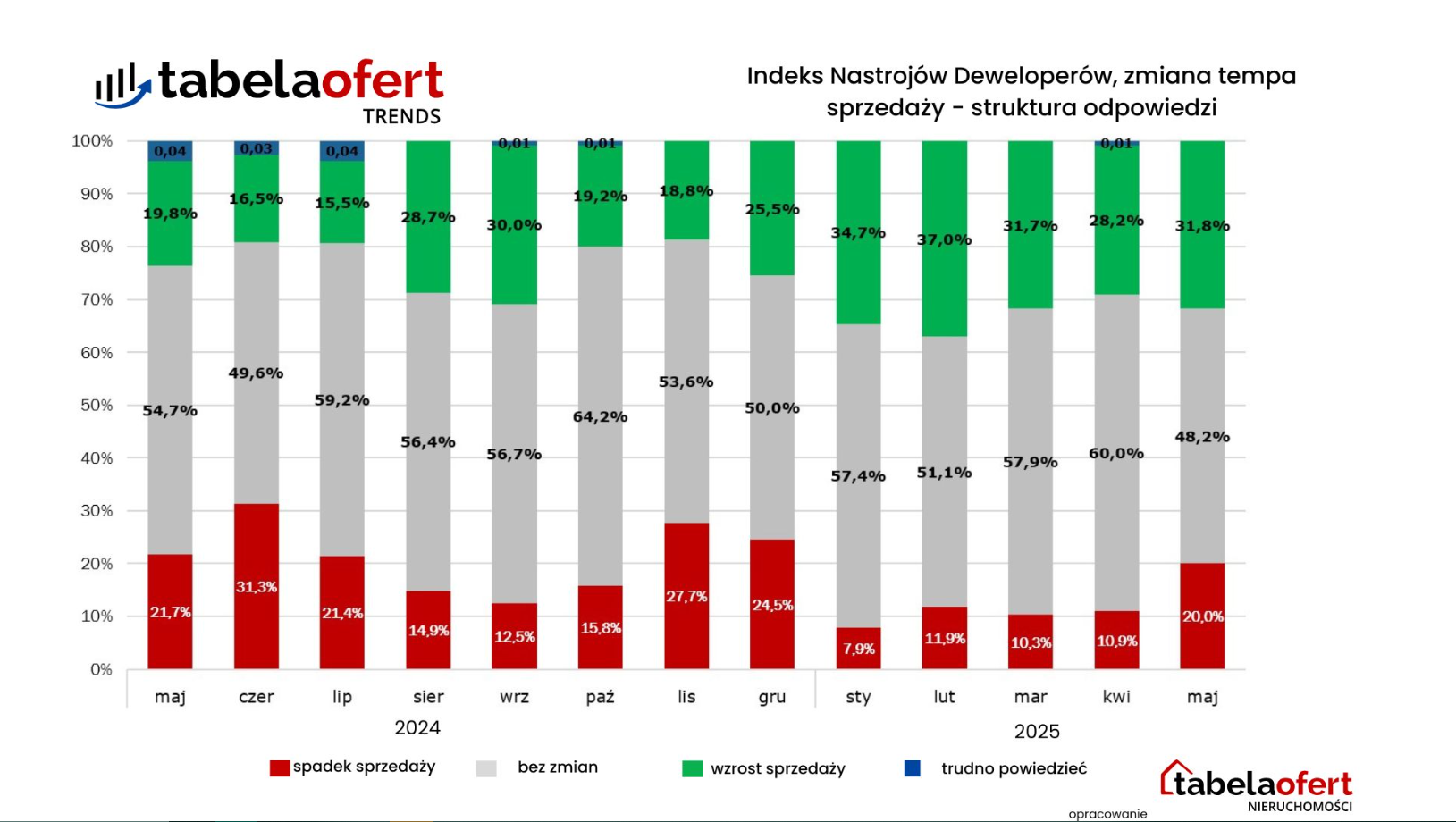 Majowy odczyt Indeksu Nastroju Deweloperów, który został opracowany przez portal Tabelaofert.pl, pokazał wzrost liczby firm obawiających się spadku tempa sprzedaży mieszkań. Względem kwietnia odczyt był wyższy o 10 pp. Jednocześnie wciąż około 30 proc. respondentów uważa, że sprzedaż wzrośnie. Niespełna 50,0 proc. uważało, że tempo sprzedaży się nie zmieni.