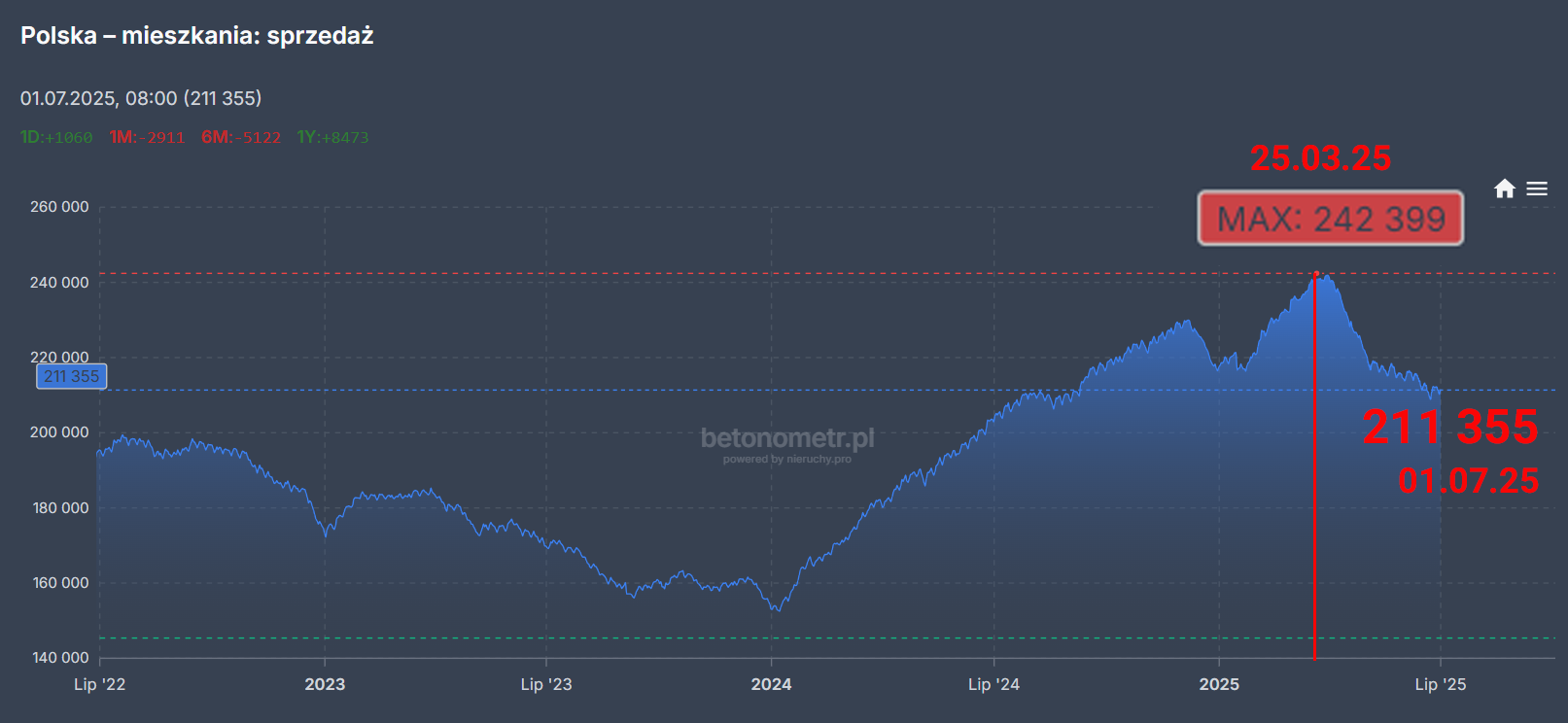 Według danych betonometr.pl, liczba ogłoszeń mieszkań z rynku wtórnego na popularnych serwisach wynosi obecnie 211 tys. To spory spadek względem rekordu z końca marca, kiedy oferta sięgała 242 399 ogłoszeń. Różnica jest znacząca, w ciągu około trzech miesięcy z rynku zniknęło ponad 30 tys. mieszkań.