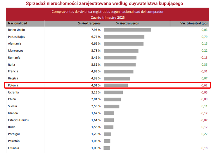 Według najnowszych danych Registradores de España, w 2025 roku zakupiliśmy w Hiszpanii aż 4 136 domów i apartamentów. To niemal powtórka z 2024 roku, który był dotychczas rekordowym okresem. Wynik pozwolił nam się utrzymać w pierwszej dziesiątce obcokrajowców mających udział w hiszpańskim rynku nieruchomości mieszkaniowych. Pierwsze trzy miejsca niezmiennie w rękach Brytyjczyków, Holendrów i Niemców.