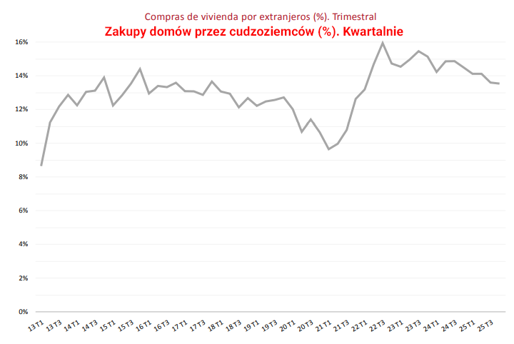 Odsetek zakupów domów przez cudzoziemców wyniósł 13,5%, osiągając nieco ponad 24 200 transakcji (w skali roku odsetek ten wzrasta do 13,8%). 57,3% z nich zostało dokonanych przez obywateli UE, a 18% przez obywateli innych krajów europejskich. Jednak odsetek ten różni się znacznie w poszczególnych wspólnotach autonomicznych, przy czym najwyższe wskaźniki odnotowano na Balearach (31,47%), we Wspólnocie Walenckiej (27,17%), Wyspach Kanaryjskich (23,12%) i w regionie Murcji (20,74%).
