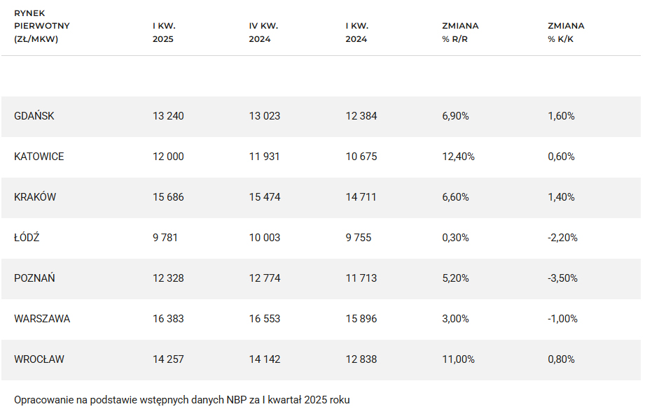 Dane NBP za I kwartał 2025 roku wskazują na postępującą stabilizację cen mieszkań. W największych polskich miastach kwartalne wzrosty były symboliczne, a w Poznaniu, Łodzi i Warszawie odnotowano nawet spadki. W ujęciu rocznym ceny mieszkań na rynku pierwotnym nadal rosły, jednak dynamika wzrostu była znacznie niższa niż w poprzednich okresach.