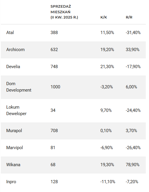 Deweloperzy notowani na warszawskiej Giełdzie Papierów Wartościowych (GPW) opublikowali wstępne wyniki sprzedaży w II kwartale 2025 roku. W ujęciu rocznym wyniki nie prezentują się imponująco, jednak widać wyraźną poprawę w ujęciu kwartalnym, sprzedaż mieszkań systematycznie rośnie z kwartału na kwartał.