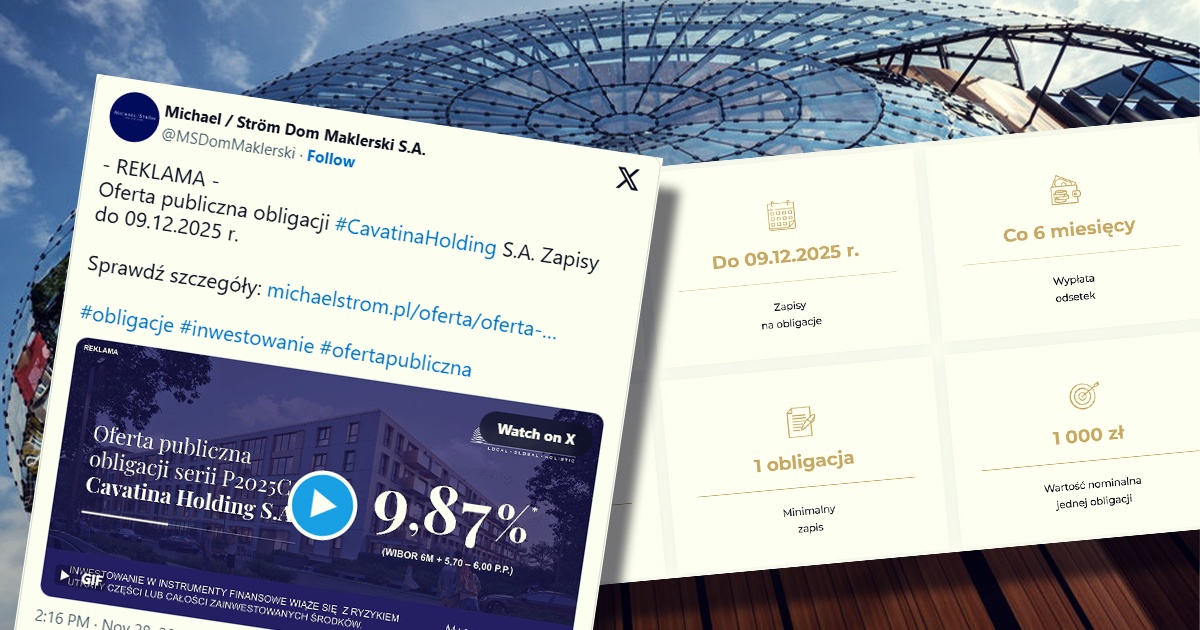 Cavatina Holding, spółka z sektora nieruchomości komercyjnych i mieszkaniowych, prowadzi emisję obligacji serii P2025C – której wartość może sięgnąć nawet 80 mln zł.
