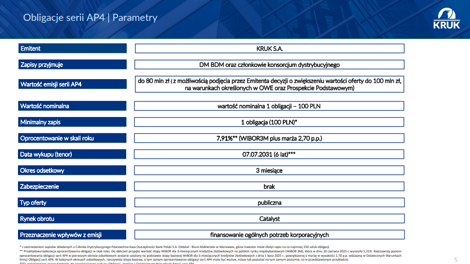 Kruk, spółka specjalizująca się w zarządzaniu wierzytelnościami, po chwili nieobecności, wróciła z nową ofertą obligacji. Seria AP4 warta 80 mln zł, oferowana będzie w ramach XI Programu Emisji Obligacji, który został zatwierdzony we wrześniu 2024 roku. Ponadto emitent zastrzega możliwość zwiększenia liczby oferowanych kuponów do maksymalnej łącznej wartości nominalnej 100 mln zł. Ostateczna liczba i wartość oferty zostanie określona z uwzględnieniem liczby zapisów, po zakończeniu okresu ich przyjmowania.