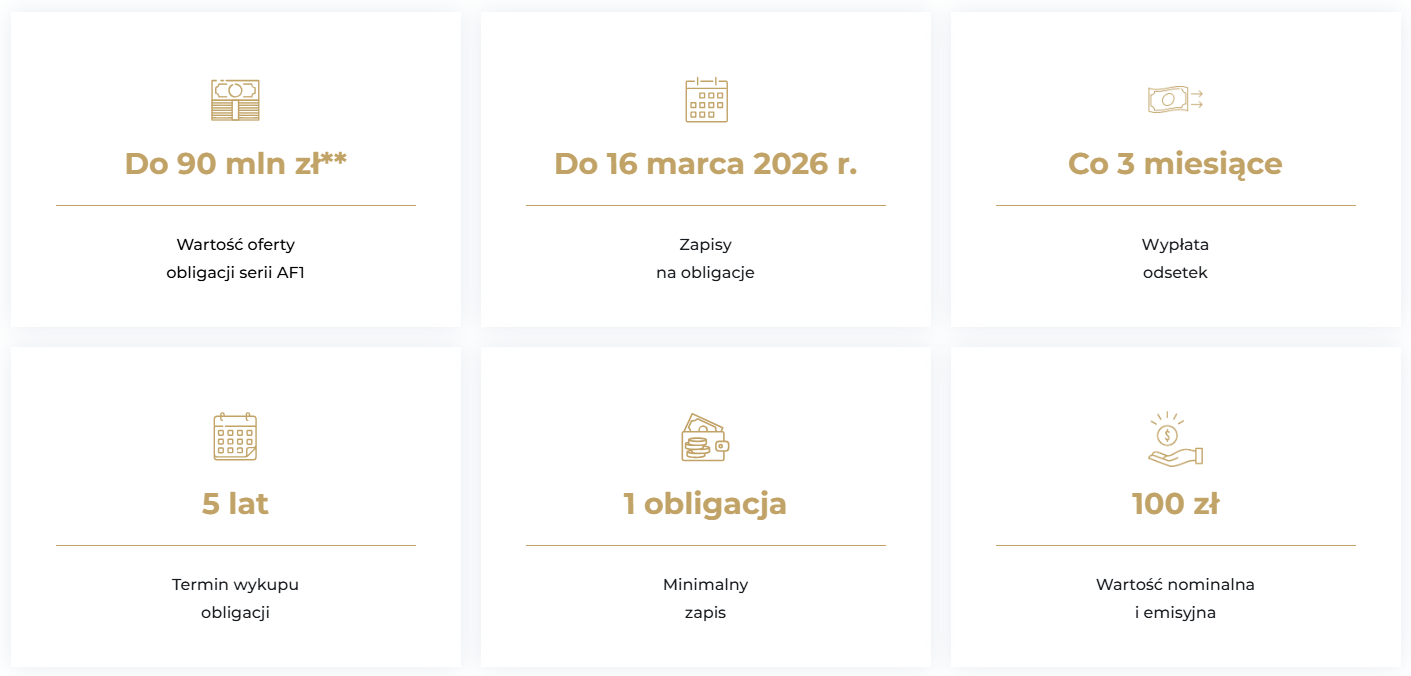 Spółka z branży zarządzania wierzytelnościami rozpoczęła emisję obligacji. Oferta dotyczy 5-letnich papierów serii AF1, których łączna wartość sięga 90 mln zł. Zapisy potrwają do 16 marca 2026 roku. Środki mają zostać przeznaczone m.in. inwestowanie w portfele wierzytelności.