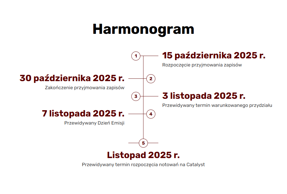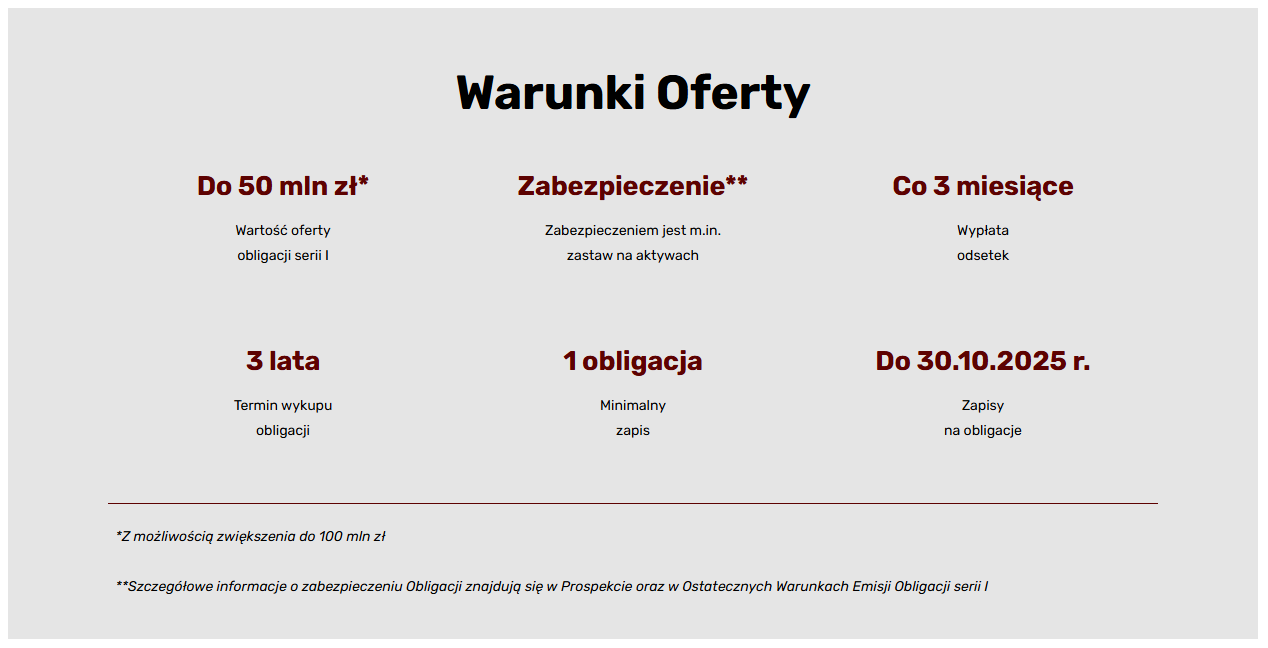 Spółka oferuje 50 tys. sztuk długu, z możliwością zwiększenia do 100 tys. Wartość nominalna wynosi 50 mln zł, a oprocentowanie będzie liczone na podstawie wskaźnika WIBOR 3M powiększonego o marżę nie niższą niż 4,25 i nie wyższą niż 4,75 pkt proc. Marża zostanie określona w dniu przydziału długu.