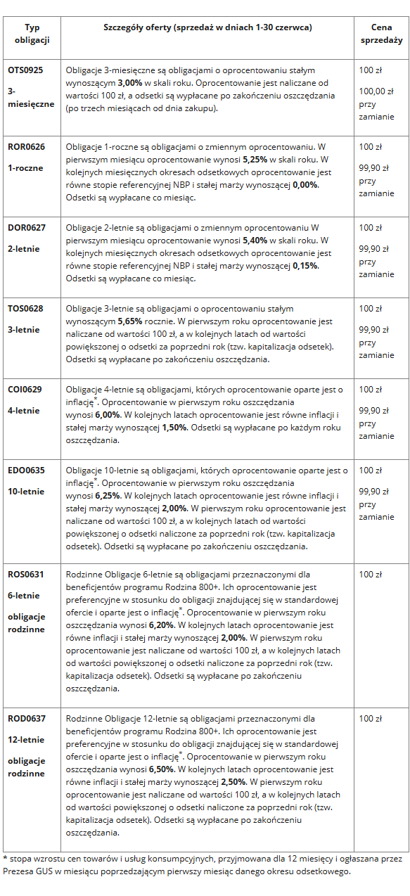 Okrojona została również oferta skierowana do beneficjentów programu „Rodzina 800 plus”. Nowe oprocentowanie, w pierwszym rocznym okresie odsetkowym 6- i 12-letnich papierów wyniesie od czerwca kolejno 6,20 proc. oraz 6,50 proc.