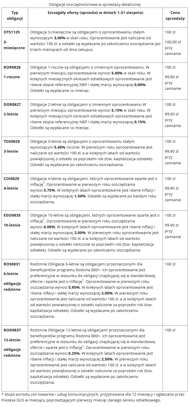 Oprocentowanie obligacji 1-rocznych i 2-letnich zmienia się co miesiąc. Jest wyliczane jako suma stopy referencyjnej Narodowego Banku Polskiego i marży, która nie została zmieniona i wynosi w przypadku instrumentów oferowanych w sierpniu 0,00% dla obligacji 1-rocznych oraz 0,15% dla 2-letnich. Oprocentowanie obligacji 4-letnich ulega zmianie co roku i jest wyliczane na podstawie sumy wskaźnika inflacji z ostatnich 12 miesięcy oraz niezmienionej marży w wysokości 1,50%. Ten sam mechanizm oprocentowania obowiązuje również dla obligacji 10-letnich, jednak w tym przypadku niezmieniona marża wynosi 2,00%. Bez zmian pozostają również preferencyjne marże dla obligacji rodzinnych, których oprocentowanie wyliczane jest według tych samych zasad co w przypadku 4- i 10-latek i wynoszą odpowiednio: 2,00% dla obligacji 6-letnich oraz 2,50% dla 12-letnich.