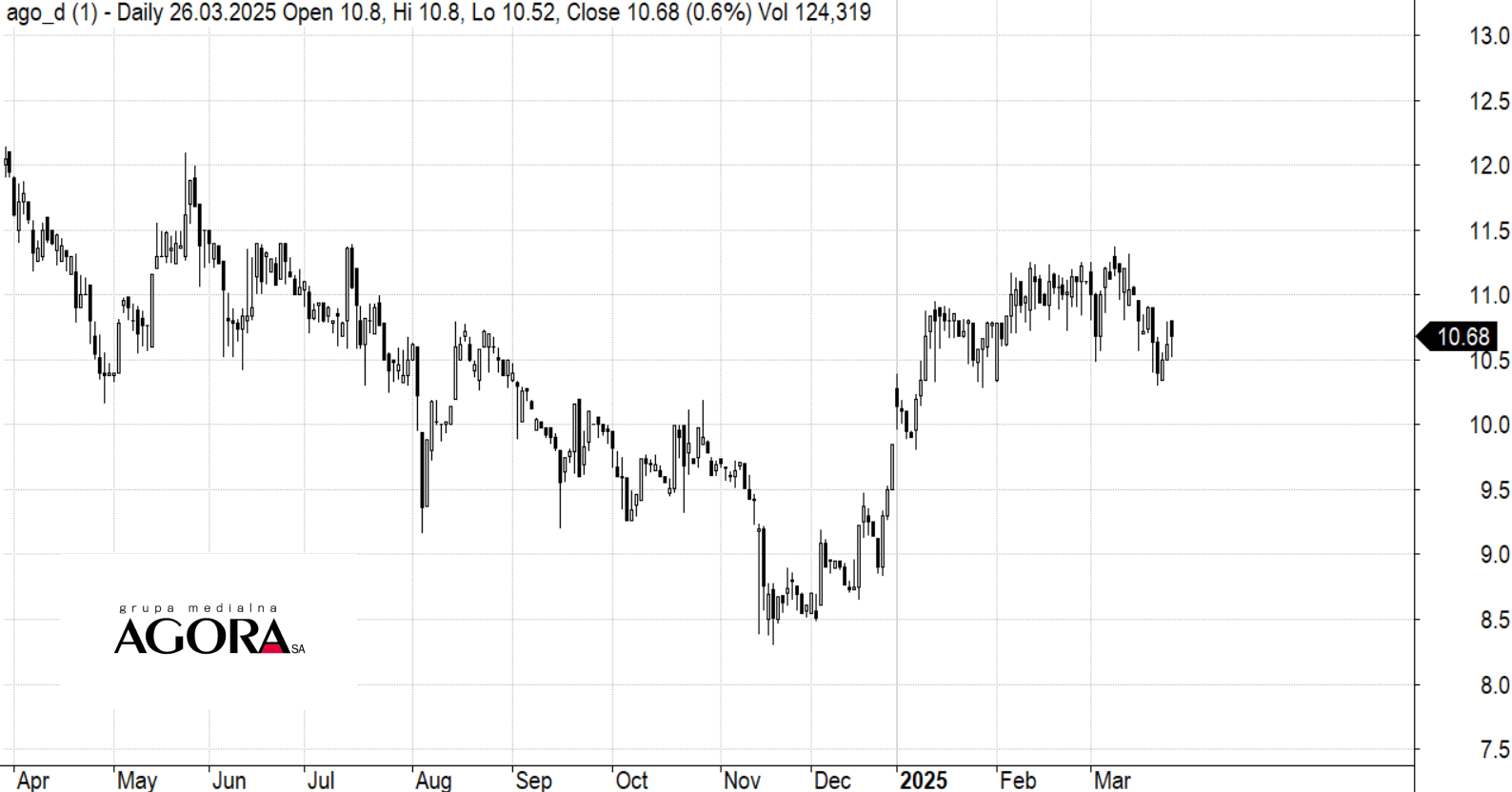 Notowania grupy Agora w ciągu ostatnich 12 miesięcy