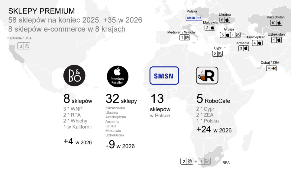 "Staramy się pozycjonować w sprzedaży detalicznej produktów premium i luksusowych dedykowanych poszczególnym markom. Mamy 8 sklepów Bang & Olufsen i w tym roku zakładamy 4 kolejne otwarcia, w tym 3 w Kalifornii. Sieć resellerska Apple sięgnęła 32 placówki i zwiększy się o 9 kolejnych w tym roku. Mamy 13 sklepów SMSN w Polsce. Mocno będziemy rozwijać koncept Robocafe z 5 punktów do niemal 30 w tym roku, szczególnie w Dubaju" - wymienił prezes.
