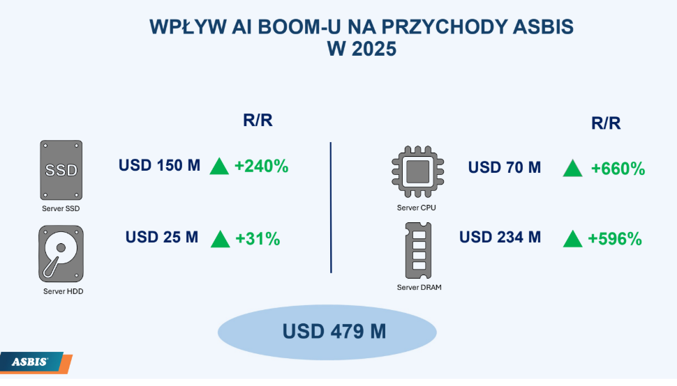 Obszar AI i data center wyrósł na nowy, strukturalny motor grupy i znakomicie widać to w liczbach. Dynamika centrów danych i komponentów serwerowych jest wyjątkowa. Zarząd oczekuje, że ma to być największy obszar wzrostu w tym roku, ale w ocenie analityków niedobory komponentów mogą utrzymywać się nawet do 2030. Asbis ma tu znakomitą pozycję – długoterminowe relacje dystrybucyjne z największymi producentami, szerokie portfolio (SSD/HDD/RAM), obecność u producentów serwerów (np. na Tajwanie jako hubie produkcji na zamówienia klientów europejskich).