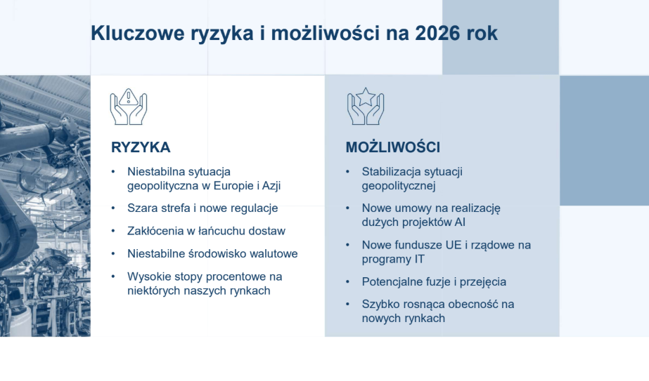 Dalszymi katalizatorami są kolejne przetargi i projekty na centra danych i AI w Europie oraz Azji Środkowej (szczególnie Kazachstan, które ma ambicje bycia centrum AI w regionie). Obok świetnych szans rynkowych trzeba też jednak być świadomym ryzyk jak cykliczność capex’u, potencjalnych opóźnień dostaw, presji cenowej, koncentracji na kilku dostawcach, czy liniach produktowych. Warto monitorować kwartalny trend przychodów i marży brutto w obszarze data center, dostępność komponentów, rotację zapasów i kapitał obrotowy.