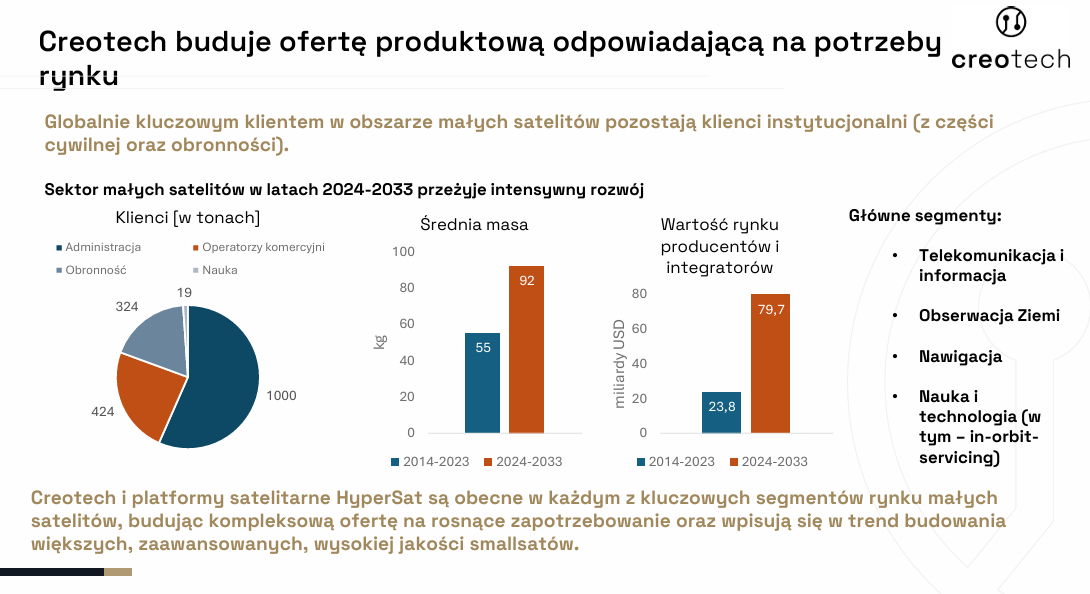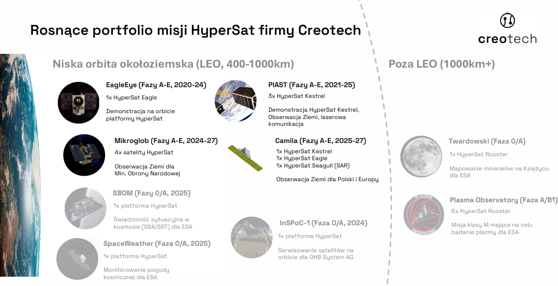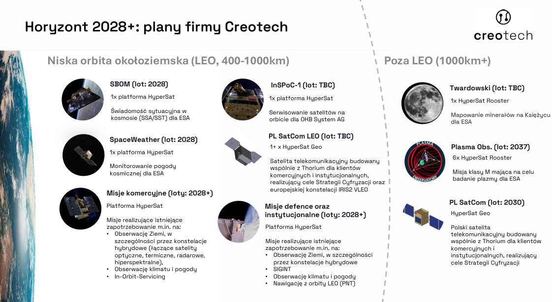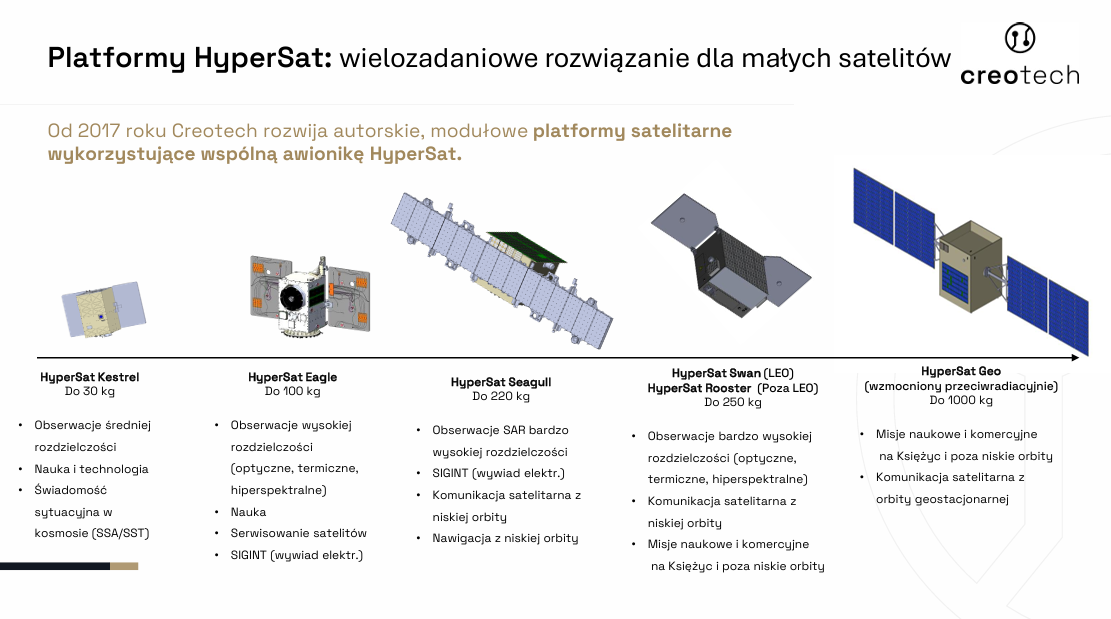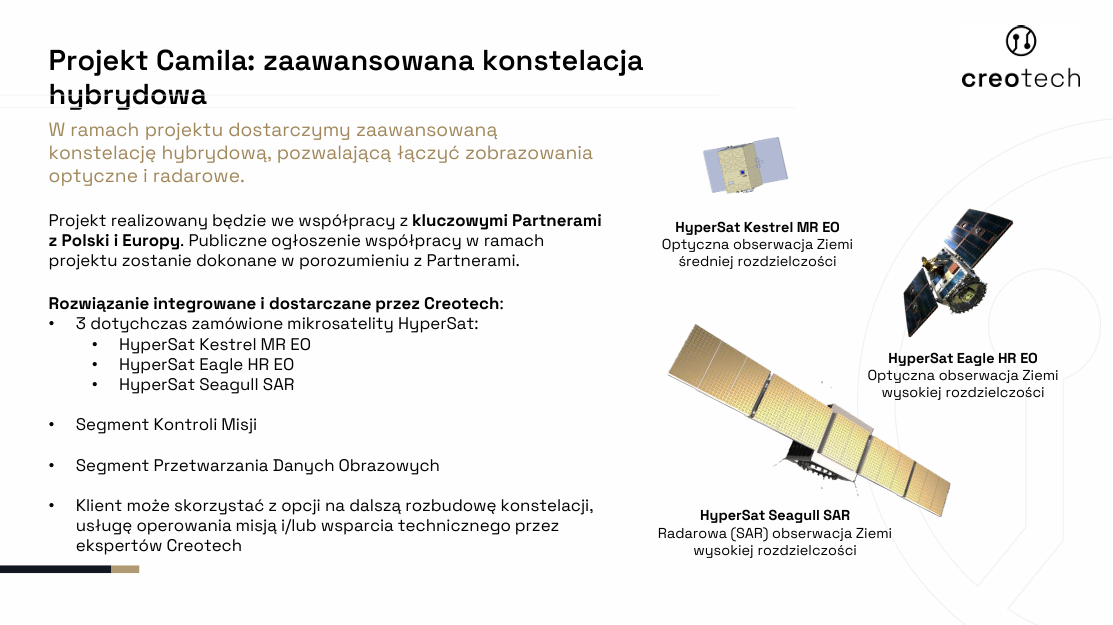 Zgodnie z przedstawionym planem, Creotech będzie odpowiadał m.in. za zaprojektowanie i integrację platform satelitarnych w oparciu o rozwijaną od lat technologię HyperSat. Na potrzeby projektu powstanie również dedykowany segment naziemny, zdolny do zarządzania satelitami i przetwarzania danych w czasie zbliżonym do rzeczywistego (quasi real-time), co jest kluczowe m.in. dla zastosowań kryzysowych i obronnych.