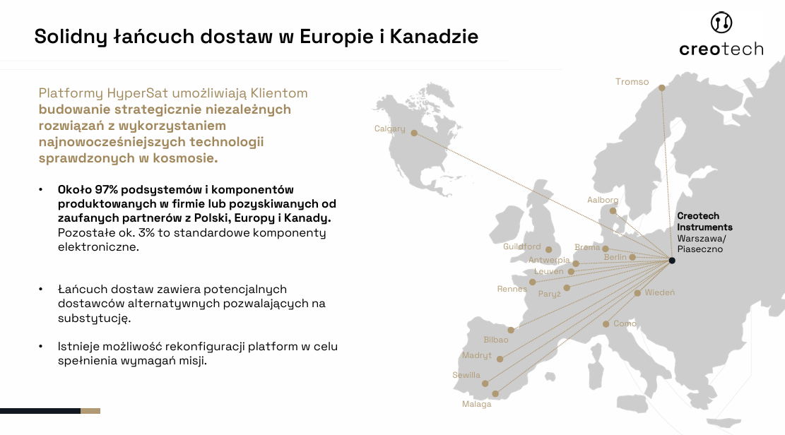 Podczas spotkania padła również ciekawa informacja o strukturze komponentów wykorzystywanych w projektach Creotech. Jak zaznaczono, Komisja Europejska miała pochwalić spółkę za wyjątkowo niezależny łańcuch dostaw – aż 97% wykorzystywanych części i technologii pochodzi z Europy. Zaledwie 3% to komponenty z USA, a z Chin nie pochodzi ani jeden element. W czasach geopolitycznych napięć i walki o suwerenność technologiczną, to sygnał o niebagatelnym znaczeniu.