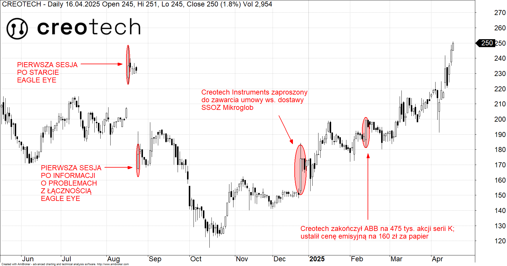 Dom Maklerski Trigon wznowił 7 kwietnia wydawanie rekomendacji dla Creotech Instruments, nadając spółce zalecenie „kupuj” z ceną docelową na poziomie 320 zł. To znacząco powyżej kursu z dnia sporządzenia raportu, który wynosił 222 zł.