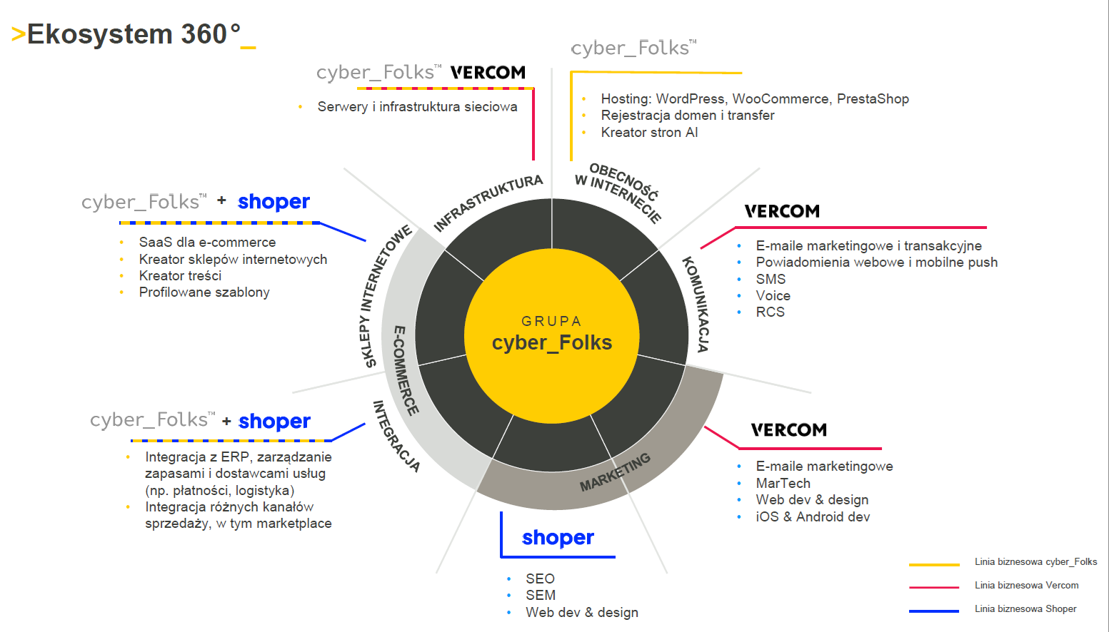 Pod jednym dachem, w grupie mamy bardzo mocno doświadczone spółki, które są liderami w swoich segmentach. Shoper jest dzisiaj liderem polskiego rynku e-commerce jeżeli chodzi o dostawę narzędzi. Vercom, z kolei, jest liderem rynku narzędzi do marketingu on-line i do całej komunikacji transakcyjnej. Zaś cyber_Folks jest liderem rynku w Europie Środkowej w usługach hostingowych i domenowych. Mamy wszystko co jest potrzebne firmie, by zaistnieć w sieci i tę obecność prowadzić z dużym sukcesem