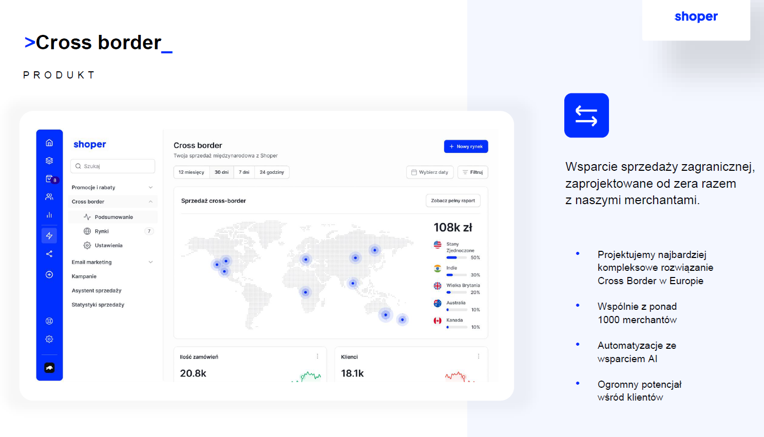 Kolejnym strategicznym kierunkiem rozwoju Shopera jest model Cross Border, projektowany wspólnie z merchantami, którego celem jest wsparcie sprzedaży zagranicznej. Ambicją spółki jest stworzenie najbardziej kompleksowego rozwiązania w tym obszarze w Europie. Spółka w ten sposób odpowiada na rosnące zapotrzebowanie klientów chcących sprzedawać poza Polską, lecz nieposiadających kompetencji ani wiedzy, jak to zrobić.