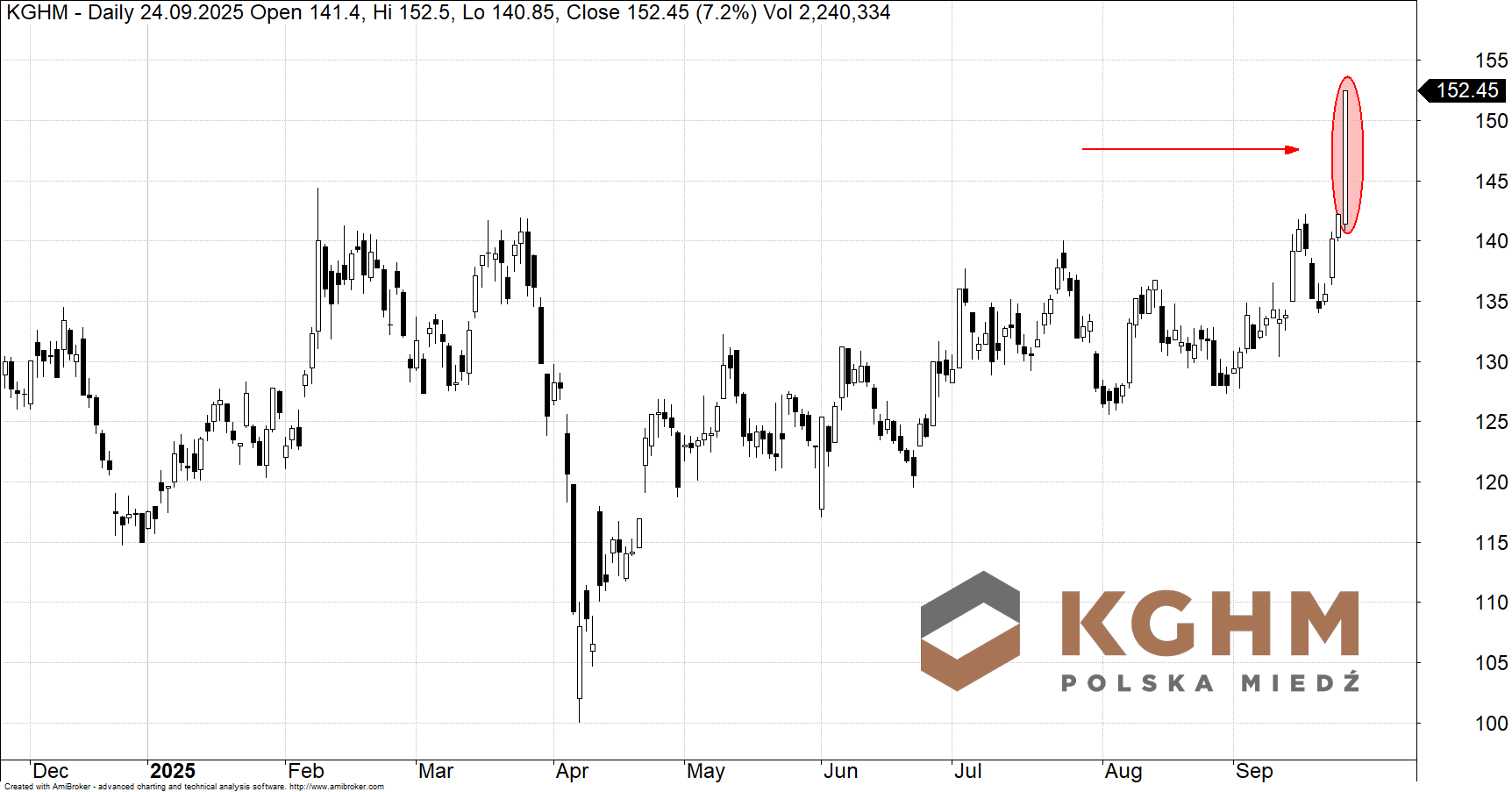 Kurs KGHM pnie się w górę, kiedy ceny miedzi rosną z powodu problemów w kluczowych światowych kopalniach - Grasberg w Indonezji, El Teniente w Chile oraz ostatnio Constancia w Peru doświadczają z różnych powodów zakłóceń produkcji. Taka sytuacja może doprowadzić do istotnych niedoborów na rynku miedzi, co z kolei napędza wzrost cen surowca i umacnia notowania akcji polskiego miedziowego giganta.