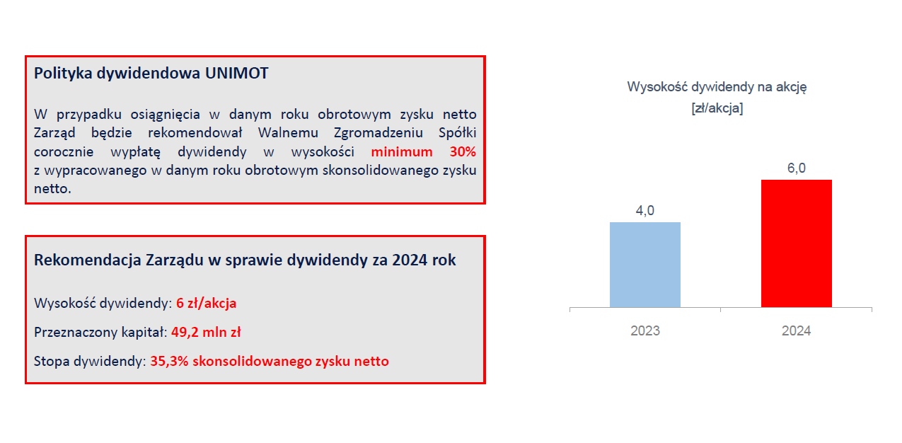 Zarząd UNIMOT zarekomendował wypłatę dywidendy z zysku za 2024 rok w wysokości 6 zł na akcję. Jest to więc druga najwyższa dywidenda w historii spółki, po rekordowych 13 zł w 2022 roku. Przeznaczony na ten cel kapitał wynosi 49,2 mln zł, co stanowi 35,3% skonsolidowanego zysku netto.
