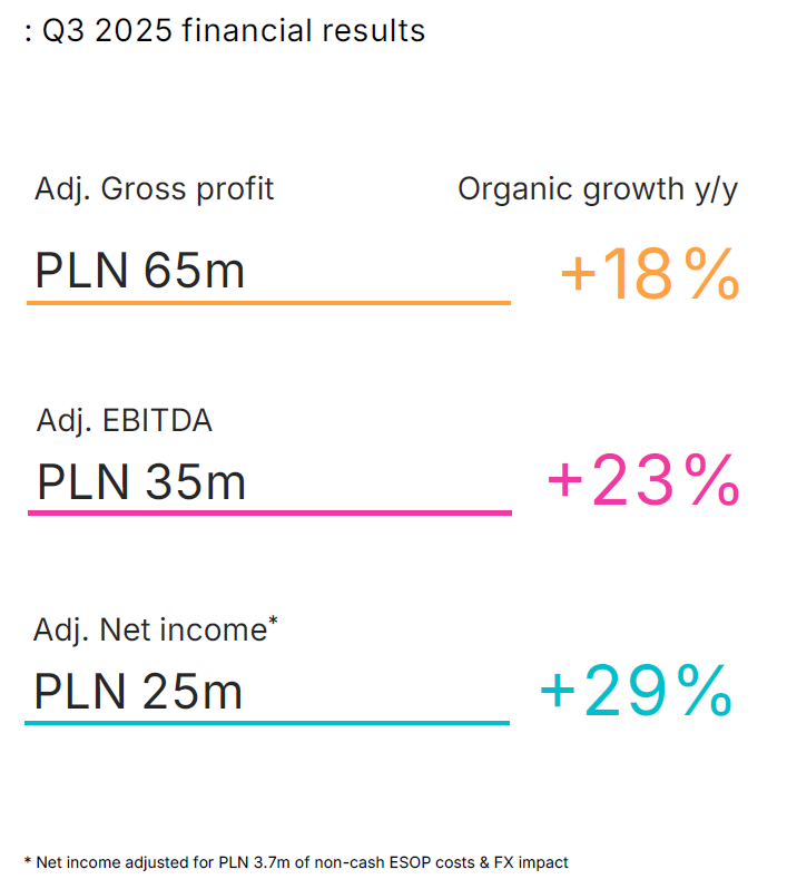 Vercom zakończył trzeci kwartał z wyraźną poprawą wyników finansowych. Marża brutto wzrosła o 18% rok do roku i wyniosła 65 mln zł. Skorygowana EBITDA sięgnęła 35 mln zł, notując wzrost o 23%, a skorygowany zysk netto osiągnął 25 mln zł (+29% r/r).