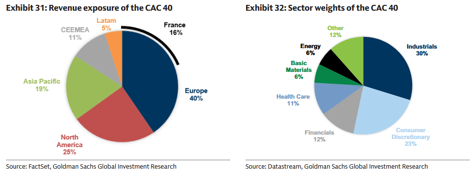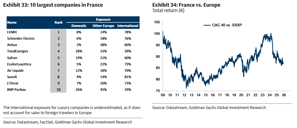 Do tego dochodzą wyceny. France Domestic ma być wyceniany ok. 8x P/E - jako jeden z największych historycznie dyskontów do CAC 40. A jeśli scenariusz walutowy Goldman Sachs się spełni (EUR/USD 1,25 w 12 miesięcy), presja na globalnie wystawione francuskie spółki może się utrzymać, a krajowe - relatywnie skorzystać.
