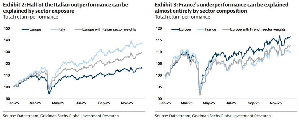 To nie znaczy, że sektory nagle przestały się liczyć. Włochy i Hiszpania - dwa najmocniejsze rynki 2025 r. - urosły odpowiednio o 34% i 51% od początku roku. Pomogło im to, że są mocno „ustawione” pod Finansowe i Utilities, czyli dwa najlepsze sektory w Europie w tym roku. We Włoszech same sektory tłumaczą około połowę przewagi nad rynkiem, a reszta wynika z czynników stylu (np. Value) i elementów lokalnych. Francja w danych wygląda inaczej: jej słabość niemal w całości da się wytłumaczyć tym, jakie sektory ma w indeksie.