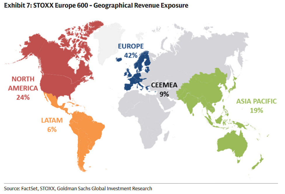 To jest ważna kwestia, o której często się zapomina. STOXX Europe 600 bierze tylko 42% przychodów z Europy. Reszta to świat: 24% z Ameryki Północnej, 19% z Azji i Pacyfiku oraz 15% z pozostałych rynków wschodzących. Dla porównania - TOPIX ma ok. 60% przychodów z Japonii, a S&P 500 ok. 70% z USA.