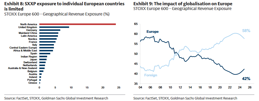 To „umiędzynarodowienie” widać też w aktywach. Około 30% aktywów spółek ze STOXX 600 jest ulokowane w USA (ok. 20% było przed Global Financial Crisis). I to zmienia sposób, w jaki działają cła: często mniej chodzi o to, kto płaci na granicy, a bardziej o to, kto dostaje rykoszetem przez wzrost gospodarczy i kursy walut.