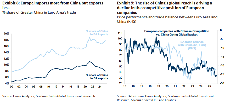 Jeśli coś ma dla Europy smak „długiej gry”, to nie są amerykańskie cła, tylko Chiny. Udział eksportu Europy do Chin dalej spada, a import z Chin pozostaje wysoki i rosnący. W tej logice chiński model wzrostu oparty o eksport coraz częściej odbywa się kosztem Europy. Ekonomiści Goldman Sachs podnieśli prognozy wzrostu PKB Chin do 2027 r., a jednocześnie obniżyli oczekiwania dla Europy - szczególnie dla Niemiec.