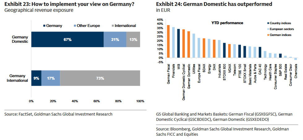 Jest jeszcze jeden detal: mimo napływów do Niemiec pozycjonowanie inwestorów ma być nadal relatywnie lekkie - odrobiono tylko ok. połowę odpływów z lat 2022+. Rekomendacja Goldman Sachs: utrzymywać ekspozycję na Niemcy, szczególnie na mid-capy, beneficjentów fiskala i konsumenta; preferowane są też tematy Domestic, Defence, Infrastructure.