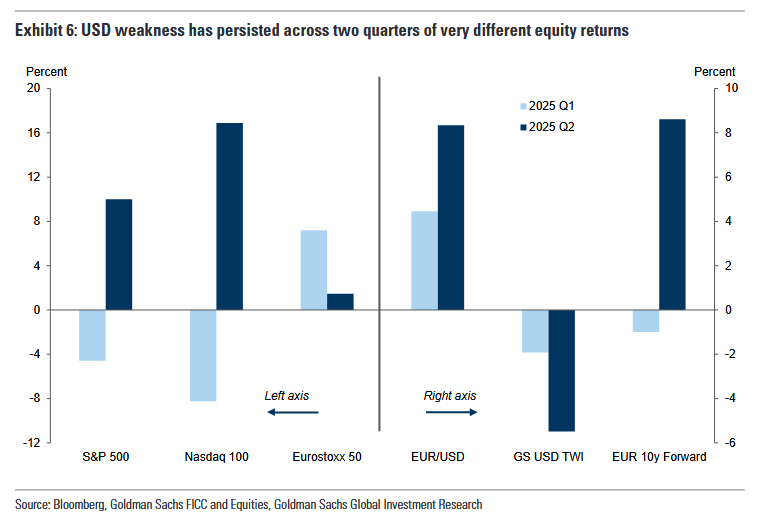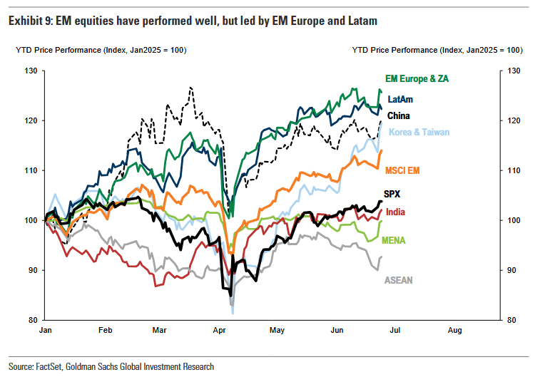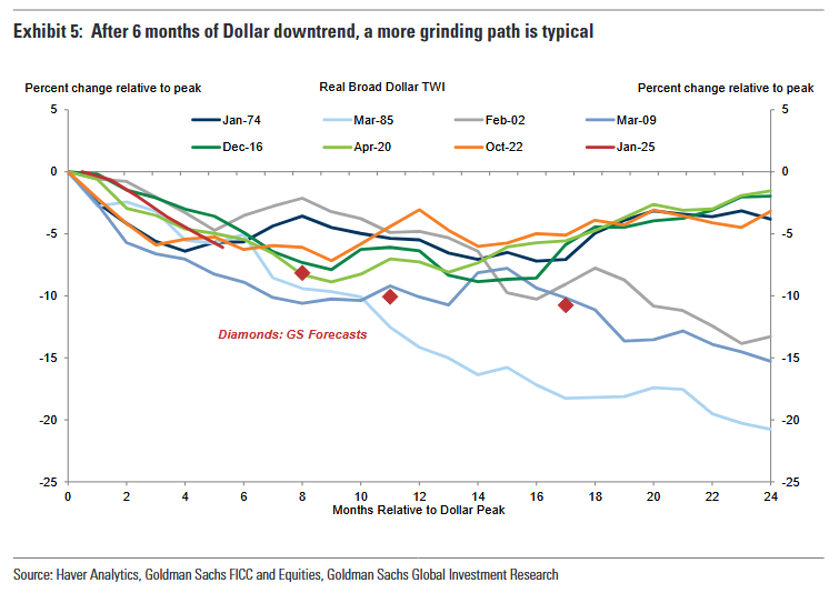 „Unikanie najgorszych scenariuszy w polityce handlowej i niższa niż oczekiwano inflacja w USA utworzyły wąską ścieżkę wzrostu dla aktywów ryzykownych i słabszego dolara” – piszą analitycy Goldman Sachs. Ich zdaniem, jeśli najbliższe dane o inflacji wciąż będą sprzyjające, amerykańska Rezerwa Federalna może szybciej niż się dziś spodziewa rynek rozpocząć obniżki stóp procentowych. To zaś dałoby dodatkowy impuls do osłabienia dolara i wsparło rynki wschodzące.