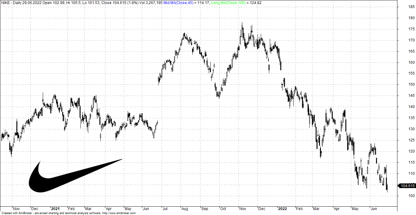 Pomimo, że akcje producenta odzieży sportowej spadły o 37% od listopadowego szczytu, kiedy to obniżono oczekiwania prognozy wyników, Nike rozczarowały inwestorów co spowodowało 6% spadku na poniedziałkowej sesji. Początkiem tygodnia producent sportowej odzieży opublikował: przychody za 4Q'22 (kończący się 31 maja) spadły o 1% w porównaniu z rokiem ubiegłym, co było spowodowane słabością segmentu w Chinach, gdzie przychody spadły o 20% oraz w Ameryce Północnej, gdzie spadły o 5% w ujęciu stałym.