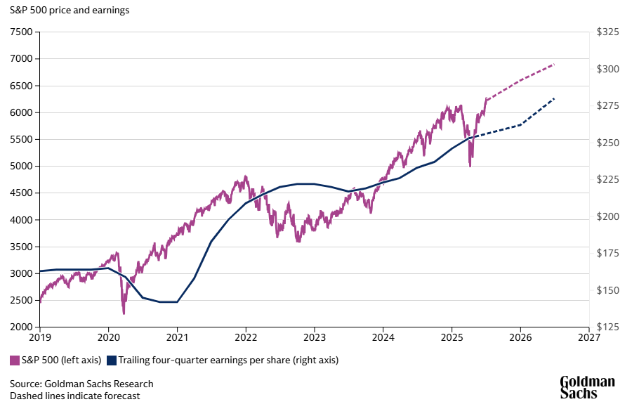 Goldman Sachs jako jeden z pierwszych wyszedł z podwójnym podwyższeniem prognoz. Bank zakłada, że do końca 2025 roku S&P 500 wzrośnie do 6,600 punktów (wcześniej 6,100), a w horyzoncie 12 miesięcy osiągnie nawet 6,900 punktów. David Kostin, główny strateg akcji amerykańskich, tłumaczy to „wcześniejszymi i głębszymi cięciami stóp przez Fed” oraz niższymi rentownościami obligacji.