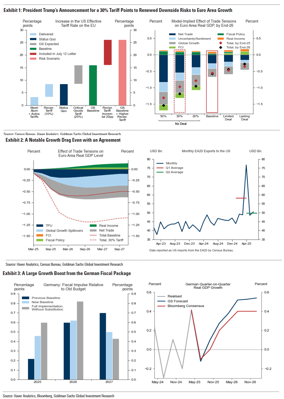 Z europejskiej perspektywy najtrudniejsze miesiące dopiero przed nami. Nawet jeśli uda się uniknąć wojny celnej w pełnej skali, niepewność polityczna i zaburzenia handlowe pozostają. W scenariuszu bazowym Goldman Sachs zakłada umiarkowane cła (25% na dobra krytyczne, w tym farmaceutyki) i szacuje spadek PKB o 0,6%. Ale jednocześnie prognozuje brak wzrostu w III kwartale i ledwie 0,1% w IV kwartale 2025.