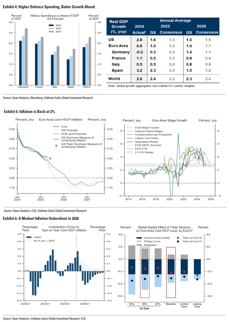 Co ciekawe, mimo wzrostu wydatków (także obronnych), inflacja w Europie pozostaje pod kontrolą. W czerwcu osiągnęła dokładnie 2%, a wzrost płac – według danych z serwisu Indeed – zszedł poniżej 2,5%. Goldman spodziewa się wręcz lekkiego niedoszacowania inflacji bazowej w 2026 roku, m.in. z powodu aprecjacji euro o 6% od początku roku.