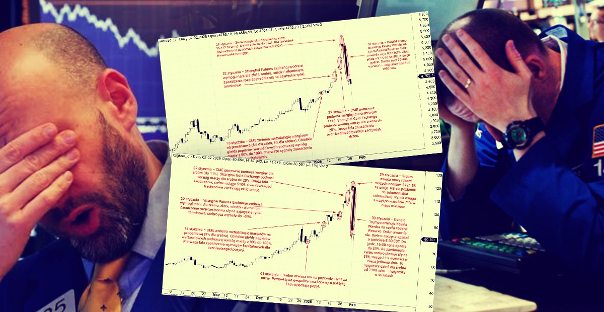 Pojawiają się szacunki, że same podwyżki obowiązkowych depozytów, nawet bez zmiany ceny metalu, mogły „wypchnąć” z rynku 0,8-1,2 mld USD. Gdy do tego dołożyć pierwszy ruch spadkowy, mechanika jest prosta. Najpierw trzeba sprzedawać, żeby spełnić wymagania, potem spadek uruchamia kolejne margin calle, a na końcu do gry wchodzą automatyczne stop-lossy i efekt widać w postaci kolejnych spadków cen srebra i złota.