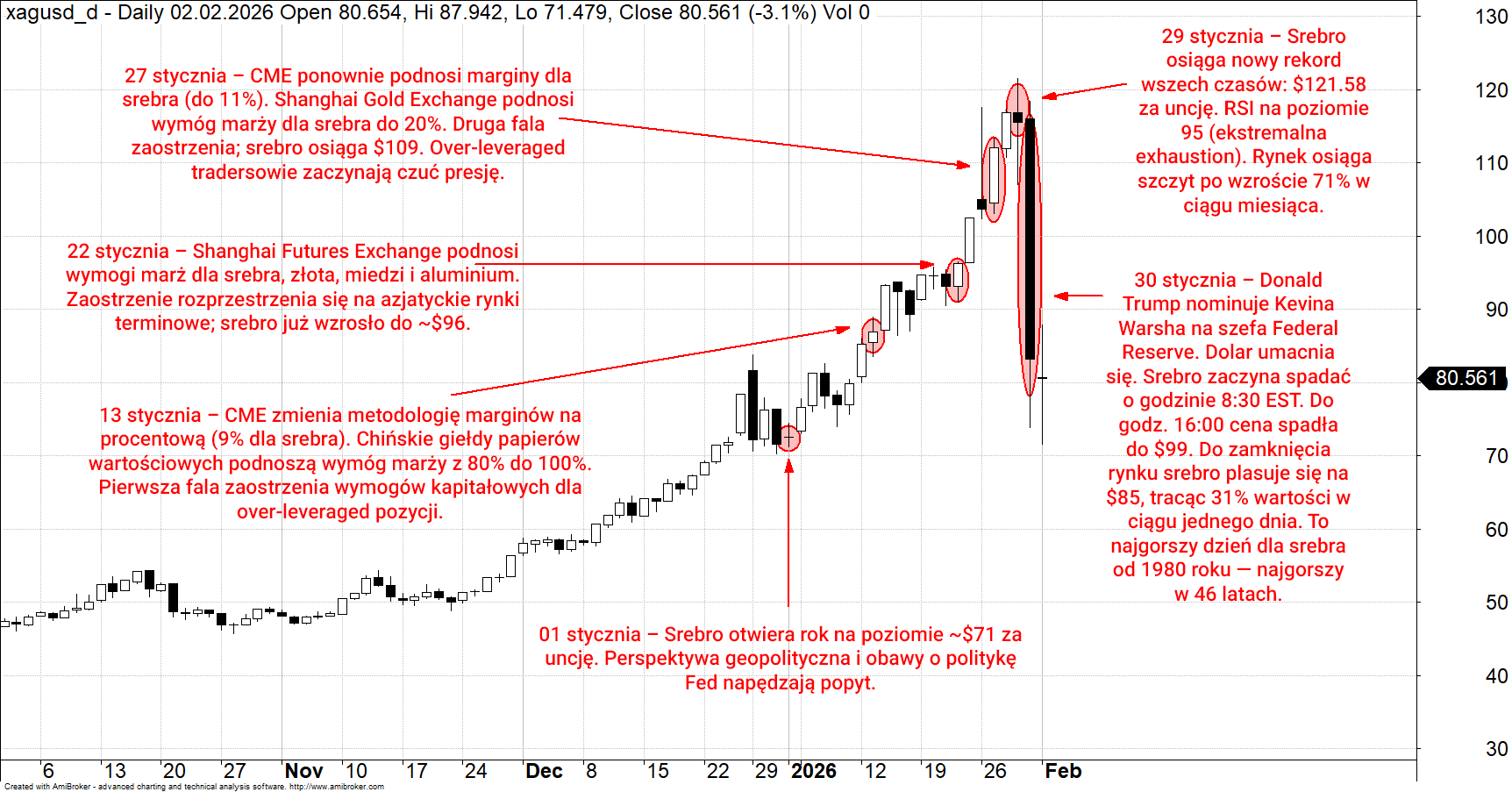 Skala wcześniejszych wzrostów też robi swoje. W samym styczniu srebro urosło o 40%, a złoto o 15%. Wspomina się też 56% wzrostu cen srebra licząc od grudnia. Przy takich dynamikach zwykle rośnie wrażliwość na każdy impuls, nawet jeśli fundamenty się nie zmieniły. Część uczestników rynku lubi tu przywoływać analogię do 1980 roku, gdy po parabolicznej zwyżce na srebrze korekta miała sięgnąć 53% i rozciągnąć się na 5-6 lat. To porównanie jest bardziej ostrzeżeniem z rynku niż twardą prognozą, ale dobrze oddaje klimat, jaki potrafi wytworzyć wykres po zbyt szybkim rajdzie.