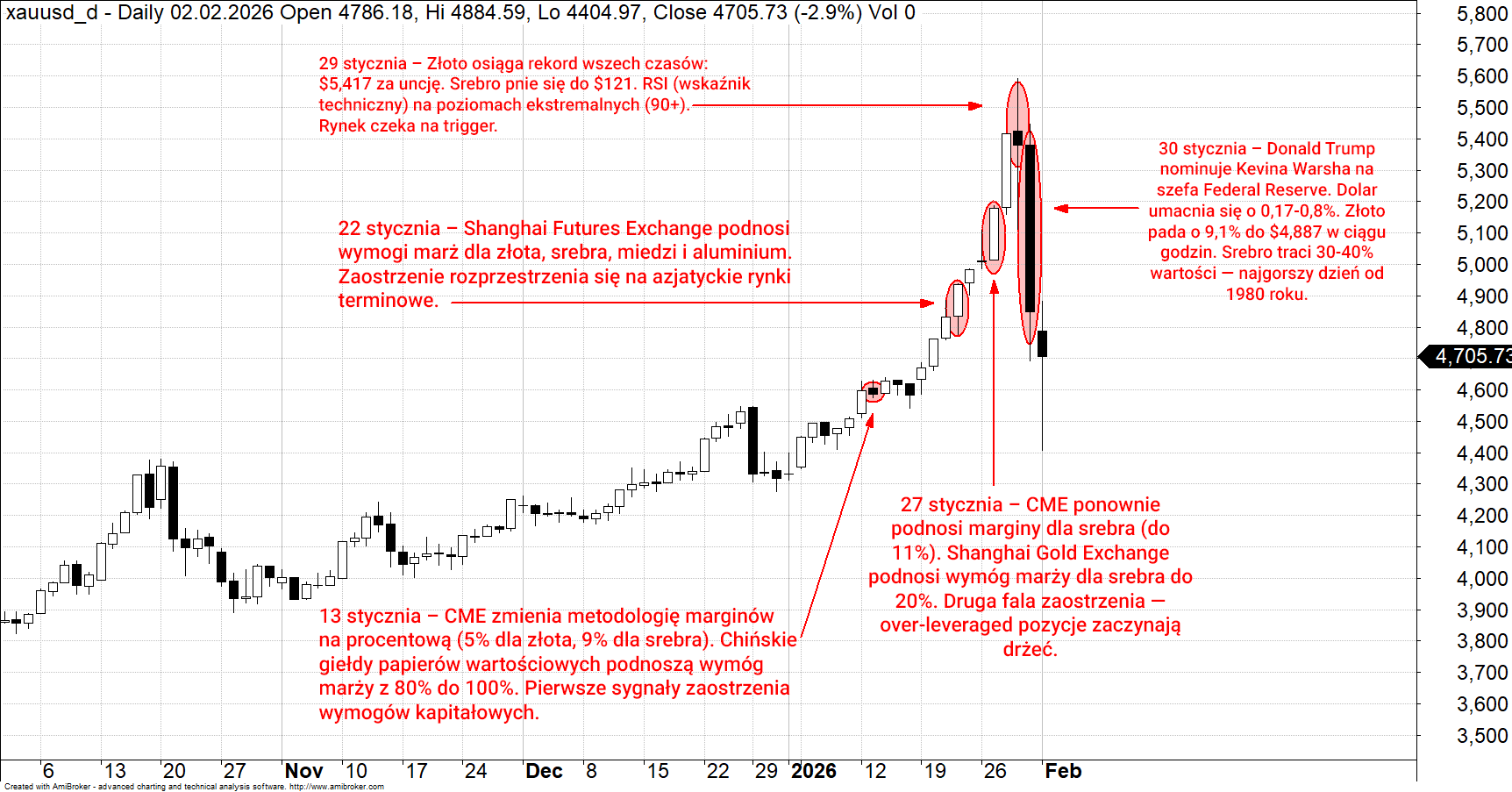 Nominacja do Fed mogła uruchomić ruch, ale siła tego ruchu wynikała z tego, jak rynek był ustawiony. Przegrzanie techniczne, podwyżki depozytów zabezpieczających, dźwignia, pochodne i psychologia tłumu potrafią w kilka sesji zrobić więcej niż pół roku debat o fundamentach. I właśnie to metale szlachetne pokazały w ostatnich dniach.