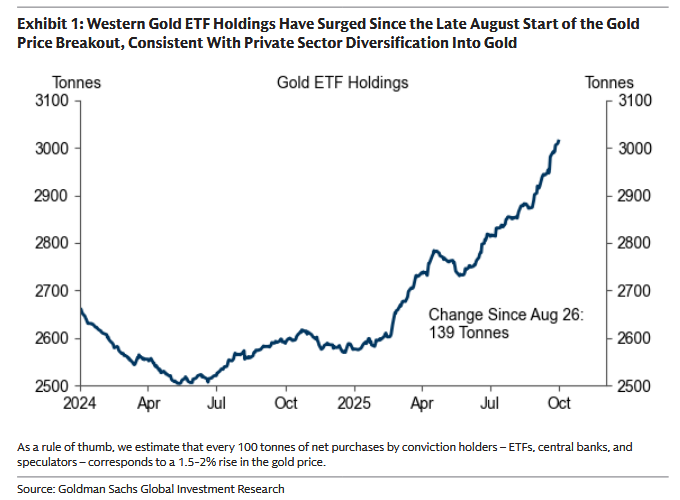 Cena złota wyrwała się z przedziału 3,200-3,450 USD za uncję i w krótkim czasie wzrosła o ok. 14%, sięgając ~3,865 USD za uncję, co oznacza 47% zwyżki od początku roku. W raporcie czytamy, że „wybicie w dużej mierze odzwierciedla powrót do zakupów przez trzy kluczowe grupy nabywców” - szybko rosnące zasoby zachodnich ETF-ów, prawdopodobne ponowne przyspieszenie zakupów banków centralnych po wakacyjnej przerwie oraz, w mniejszym stopniu, silniejsze pozycjonowanie spekulacyjne.