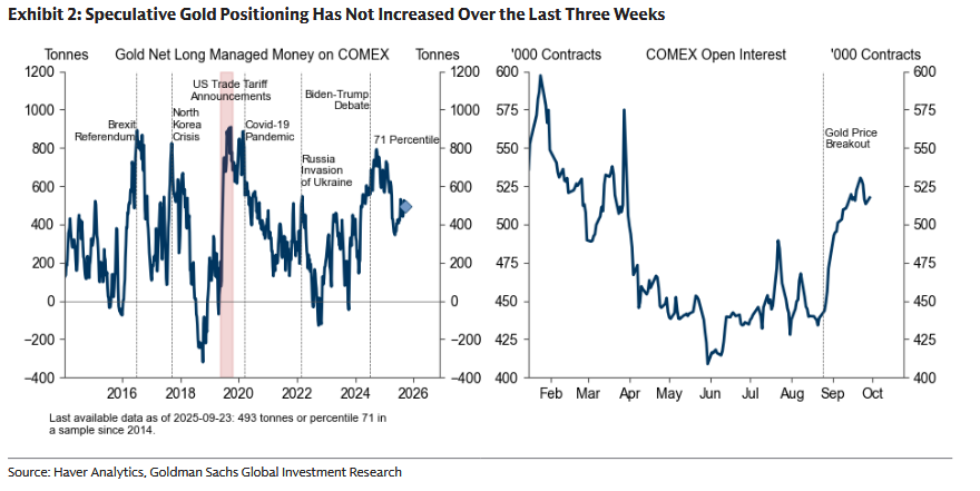 Dane zaskoczyły skalą napływów do ETF-ów. „We wrześniu zasoby zachodnich ETF-ów wzrosły o 109 ton wobec 17 ton wskazywanych przez nasz model” - piszą autorzy. To, zdaniem banku, sygnał, że materializuje się kluczowe ryzyko „w górę”: prywatni inwestorzy zaczynają szerzej dywersyfikować oszczędności w stronę złota. Jednocześnie „pozycjonowanie spekulacyjne nie wzrosło w ostatnich trzech tygodniach”, co zmniejsza ryzyko, że cały ruch był jedynie krótkoterminową grą.
