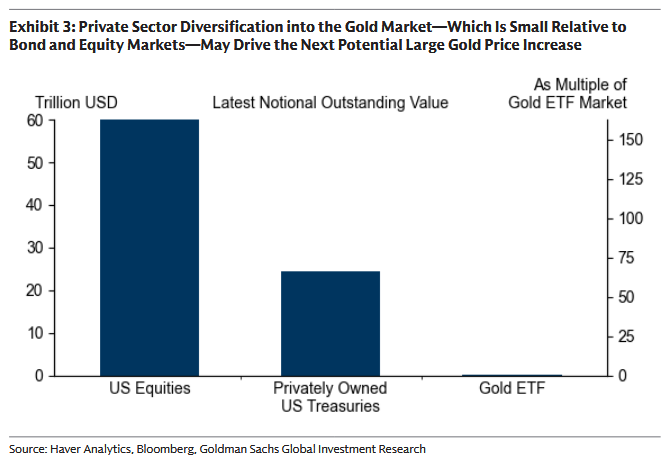 Kluczowa teza jest prosta: „zachodnie aktywa ETF-ów na złoto są warte tylko ok. 1,5% wartości prywatnie posiadanych amerykańskich Treasuries”. Skoro rynek złota jest mały względem długu i akcji, to nawet niewielkie przesunięcie oszczędności z obligacji rynków rozwiniętych może wywołać kolejny istotny skok cen.