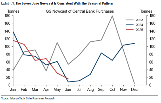 Według czerwcowego „nowcastu” Goldmana, popyt banków centralnych na londyńskim rynku OTC wyniósł 16 ton – znacznie poniżej średniej prognozy na ten rok (80 ton miesięcznie). To jednak wpisuje się w coroczny schemat: latem zakupy spowalniają, by od września znów przyspieszyć.