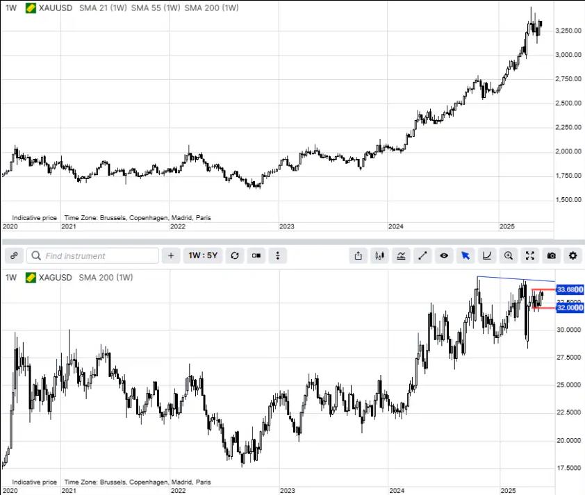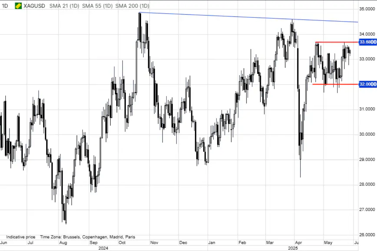 Na rynku srebra trwa długotrwała walka o wyjście z horyzontalnego trendu. Metal od miesięcy porusza się w zakresie 32–33,70 USD, a każda próba wyjścia górą kończy się niepowodzeniem. Analitycy Saxo zwracają uwagę na kluczowy opór przy 33,70 USD – dopiero jego przełamanie otworzyłoby drogę do testu październikowego maksimum sprzed roku na poziomie 34,90 USD.