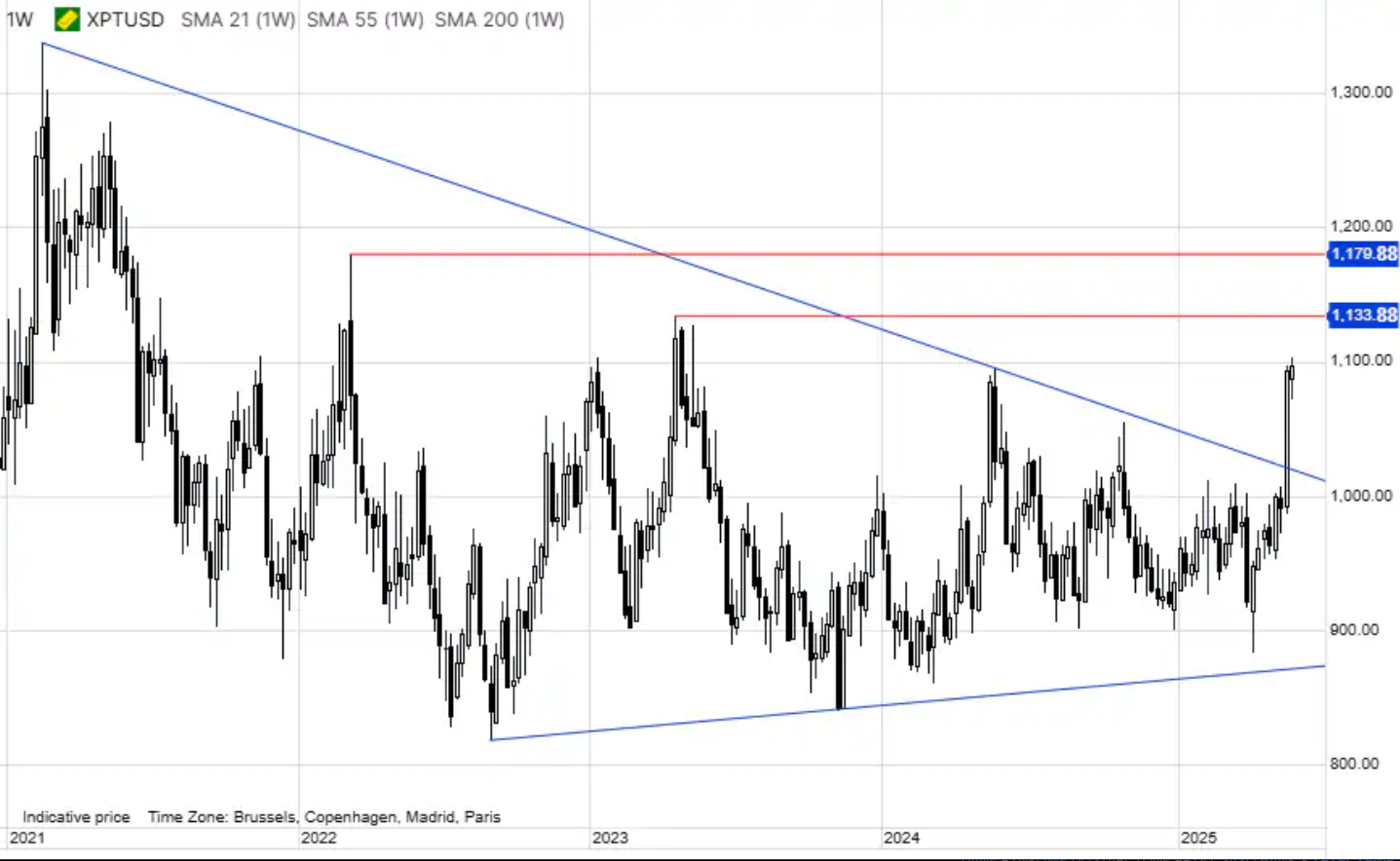 Na tle złota i srebra, to platyna staje się cichym bohaterem rynku. W ostatnich tygodniach metal ten – przez lata ignorowany – odnotował techniczne wybicie powyżej 1 025 USD, docierając do poziomów niewidzianych od dwóch lat. Analitycy Saxo Banku tłumaczą ten ruch zarówno poprawą fundamentów, jak i nowym zainteresowaniem ze strony inwestorów spekulacyjnych.