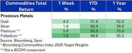 Na tle nagłówków o złocie przyspiesza srebro, które inwestorzy coraz częściej prowadzą w kierunku rekordu sprzed kilkunastu lat, oraz platyna – beneficjent ograniczeń podażowych i tańsza alternatywa względem złota. Relacja cen złota do platyny gwałtownie spadła z poziomów z wiosny w kierunku średniej z ostatniej dekady, sugerując przestrzeń do dalszej normalizacji. Pallad z kolei, po latach słabości, notuje oznaki stabilizacji i najmocniejsze tygodniowe odbicie w całym koszyku metali szlachetnych.