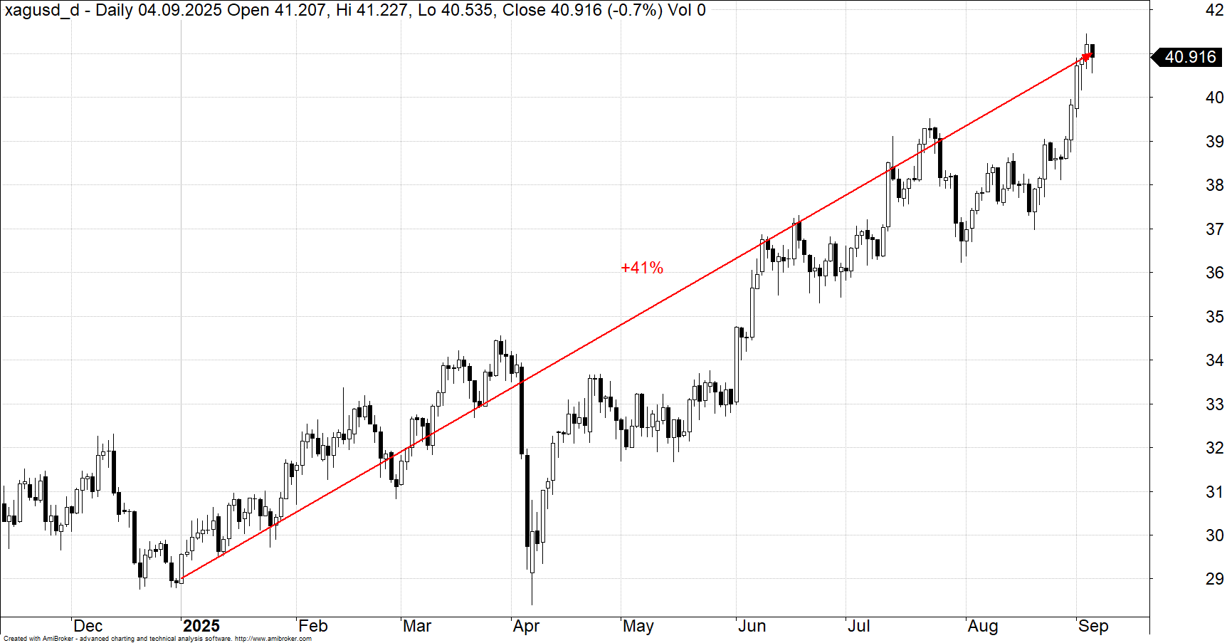 Rekord na poziomie 3547 USD za uncję i około 34% wzrostu od początku roku. Srebro przekracza 40 USD i rośnie o 41%. Te liczby nie są kaprysem rynku, tylko sygnałem, że inwestorzy szukają aktywa odpornego na polityczne turbulencje, wysokie długoterminowe stopy i kruchą wiarę w tradycyjne „bezpieczne przystanie” – argumentuje Ole Hansen, szef strategii surowcowej w Saxo.