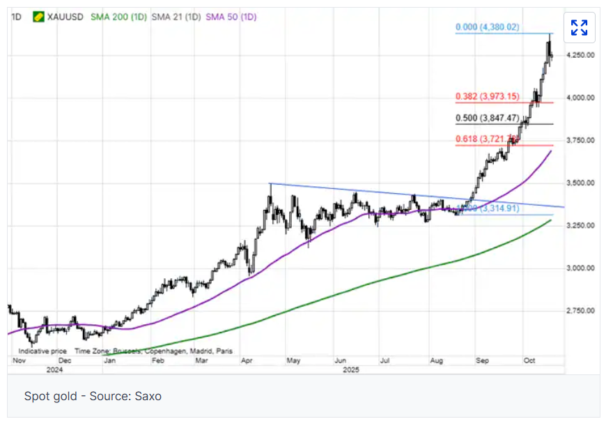 W minionym tygodniu złoto doszło do nowego szczytu przy 4 380 USD za uncję, po czym cofnęło się, gdy na rynkach akcji wzrósł apetyt na ryzyko. Hansen nazywa ten etap „pauzą, nie odwróceniem trendu”. Jego zdaniem korekta rzędu 200-300 USD byłaby „normalną reakcją rynkową”, a strefa 4 000-4 100 USD powinna przyciągać nowych kupujących. W ujęciu technicznym rynek patrzy na 4 500 USD jako kolejny psychologiczny poziom, przy wsparciu m.in. w okolicach 3 972 USD (38,2% zniesienia Fibonacciego dla ruchu sierpień-październik).