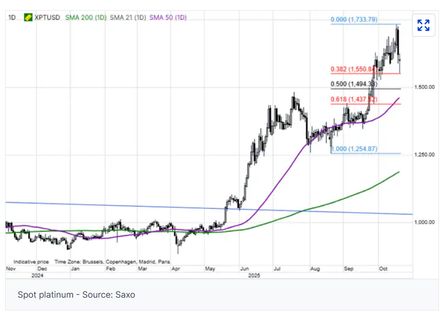 Srebro po niemal 40% wzroście od przełamania z końca sierpnia odnotowało realizację zysków. Wskaźnik złoto-srebro podskoczył do 82 z 78, co przypomina, jak wrażliwe na płynność są relacje między metalami. Kluczowe techniczne wsparcia leżą w pobliżu 49,40 USD i dalej ok. 48 USD. Na krótkim horyzoncie oczy rynku są jednak zwrócone na wynik amerykańskiego dochodzenia w sprawie Sekcji 232 dla metali krytycznych. „Traderzy traktują sprawę Sekcji 232 jako zdarzenie binarne z asymetrycznymi wynikami” – podkreśla Hansen. Brak ceł łagodziłby napięcia w Londynie i premię nad COMEX; cła przyniosłyby skutek odwrotny, szybko windując ceny z powrotem w stronę niedawnych szczytów.