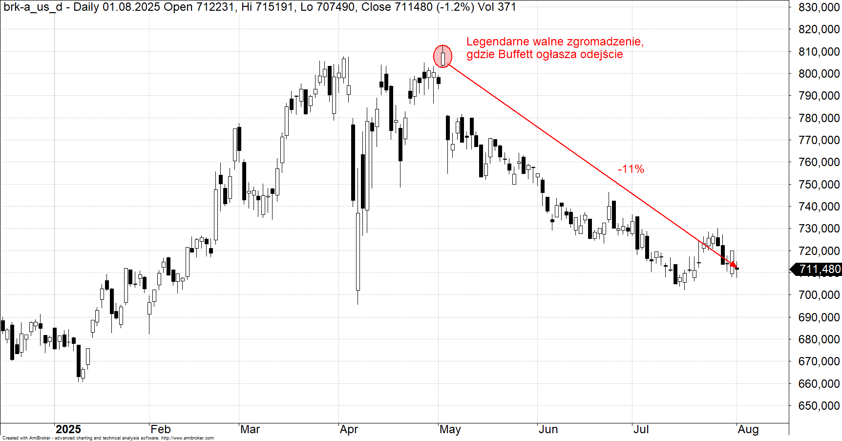 Ale inwestorzy liczyli na coś więcej. Od ogłoszenia przez Buffetta decyzji o ustąpieniu z funkcji CEO po 2025 roku, akcje spadły o 12%. Brak buybacków w drugim kwartale – i również w lipcu – nie pomógł. To wyraźny sygnał: nawet sam Buffett nie uważa dziś akcji Berkshire za wystarczająco tanie, by je skupować. Obecna wycena to ok. 1,5-krotność wartości księgowej – standard dla tej spółki, ale znacznie poniżej majowego szczytu (1,8x).