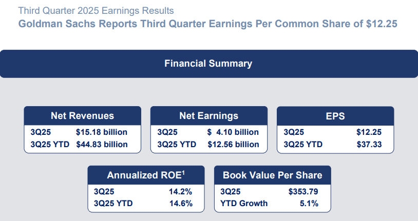 Na liczbach widać to dość jasno. W III kwartale 2025 Goldman Sachs wypracował 15,18 mld USD przychodów i 4,10 mld USD zysku netto, a od stycznia do września - odpowiednio 44,83 mld USD i 12,56 mld USD. Zysk na akcję skoczył do 12,25 USD, wyraźnie powyżej ubiegłorocznych 8,40 USD i wyżej niż w II kwartale 2025 (10,91 USD). Po dziewięciu miesiącach EPS wynosi 37,33 USD wobec 28,64 USD rok wcześniej. ROE sięga 14,2% w samym kwartale i 14,6% narastająco. Do tego rośnie poduszka kapitałowa akcjonariuszy: wartość księgowa na akcję to 353,79 USD - o 1,2% więcej niż kwartał temu i o 5,1% wyżej niż na początku roku. W praktyce daje to marżę netto rzędu ok. 27% w kwartale i ok. 28% w ujęciu 9M - solidny wynik w czasach, gdy cała branża liczy każdy punkt produktywności.